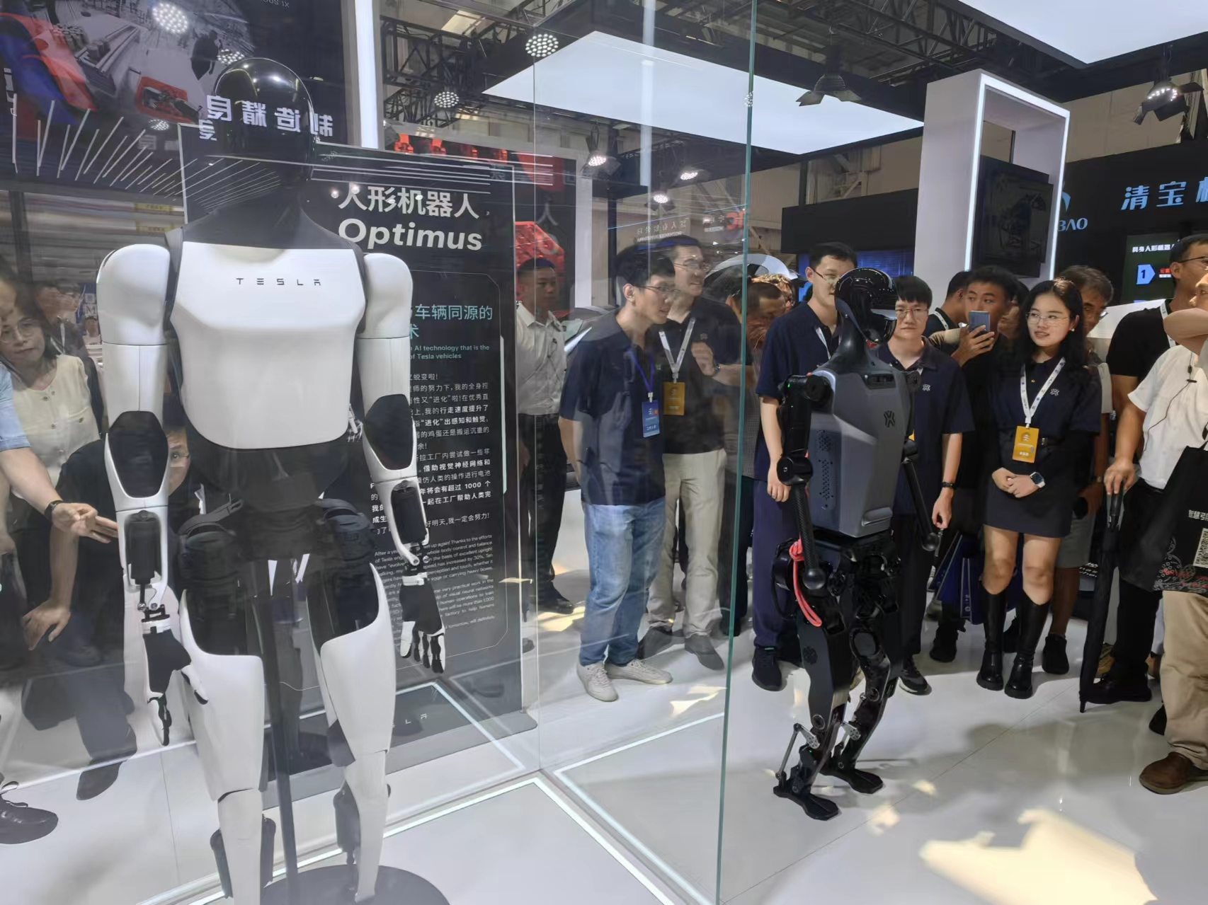 “‘天工’要去特斯拉展台,‘会晤’一下人形机器人Optimus。”工作人员话音刚落,“天工”瞬间被观众团团簇拥,争相拍照。大约行进一二百米后,“天工”抵达特斯拉展区,与在玻璃罩中展示的特斯拉人形机器人Optimus合影留念。