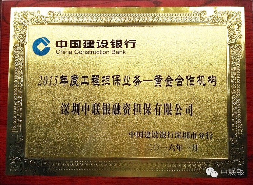 中联银荣获中国建设银行“2015年度工程担保业务-黄金合作机构”