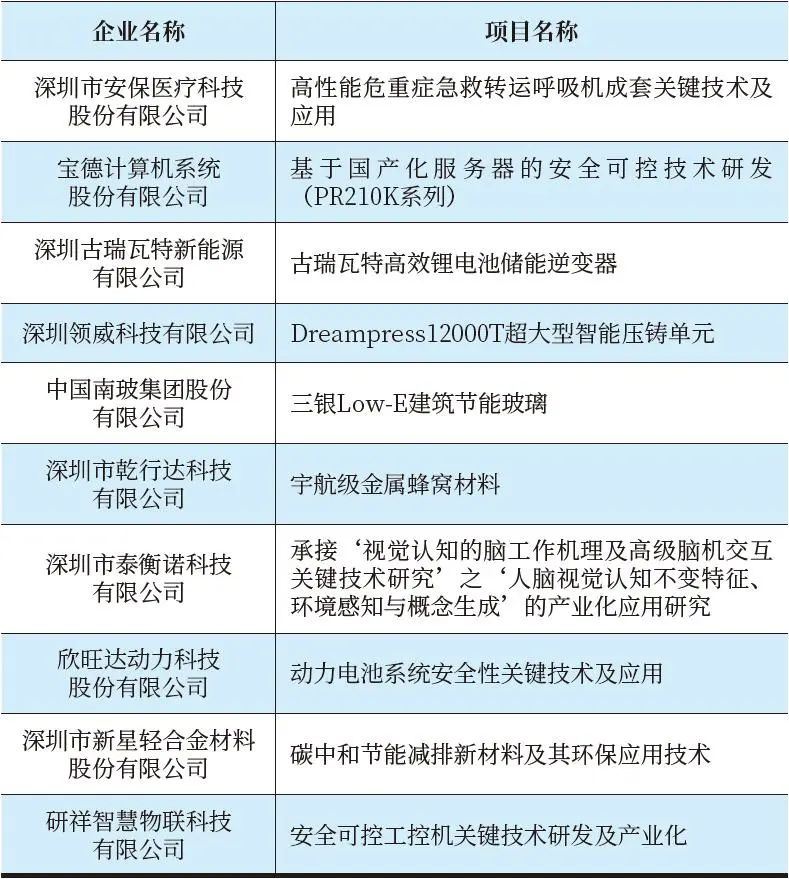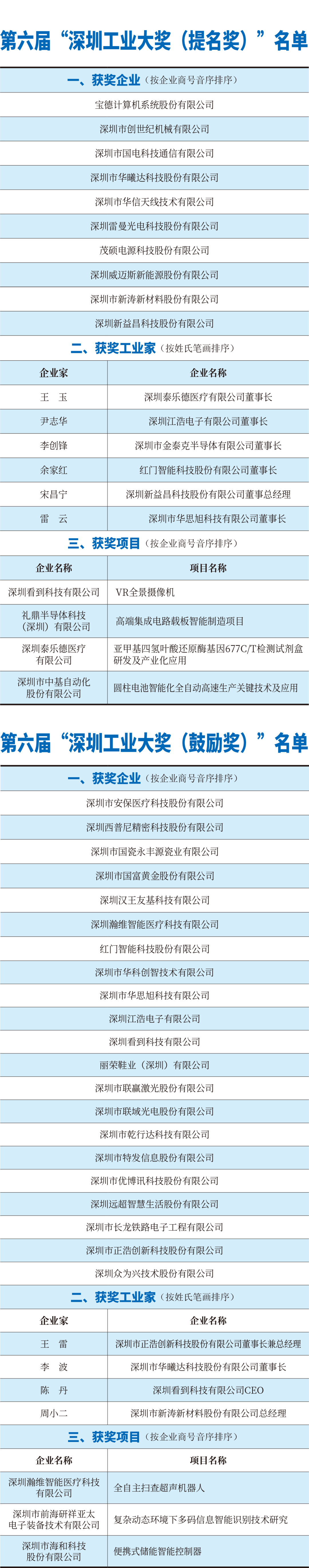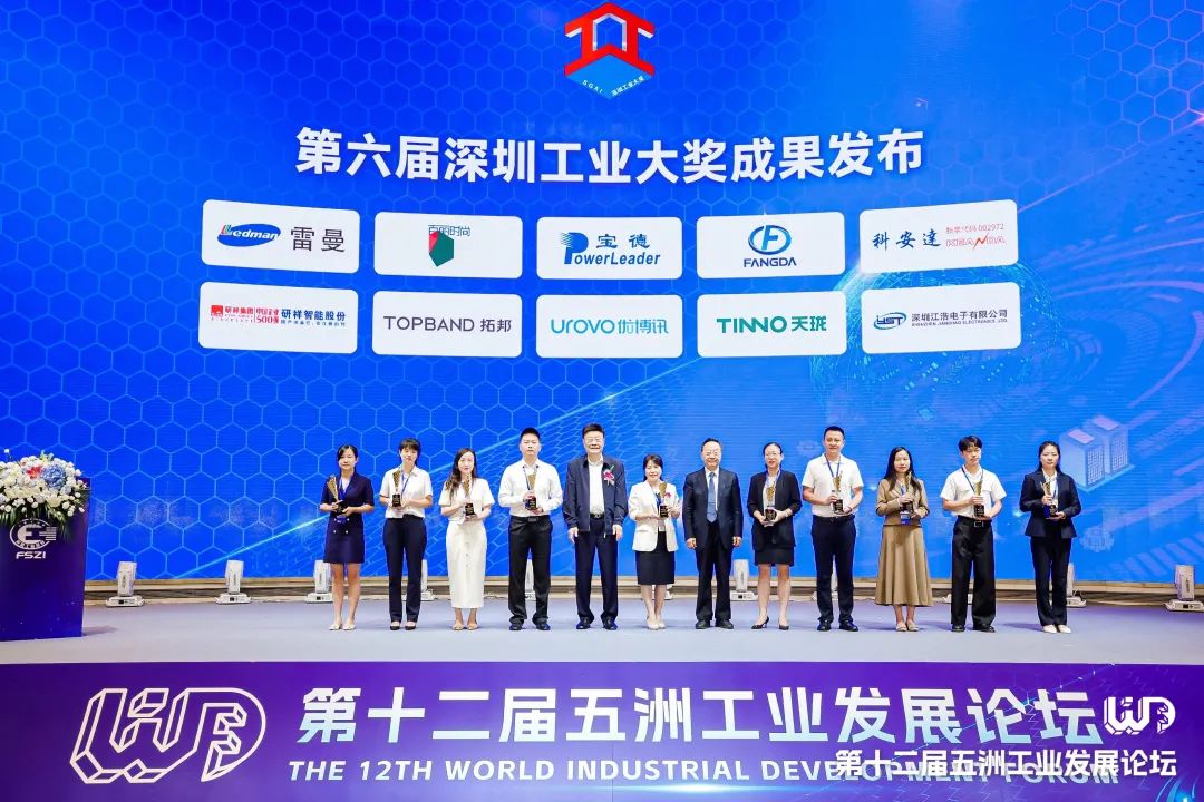传音、德方纳米、古瑞瓦特、光韵达、杰普特、科安达、新星轻合金、TCL华星、中建钢构、洲明10家企业和古瑞瓦特董事长丁永强、雷曼光电董事长李漫铁、宝德计算机董事长张云霞、研祥智能董事长陈志列、丽荣鞋业总经理陈晓明、拓邦董事长武永强、天珑移动董事长林震东、科安达董事长郭丰明、优博讯董事长郭颂、方大智源总经理熊海刚以及“深圳领威科技有限公司‘Dreampress12000T超大型智能压铸单元’”等10个项目荣获第六届“深圳工业大奖”。
