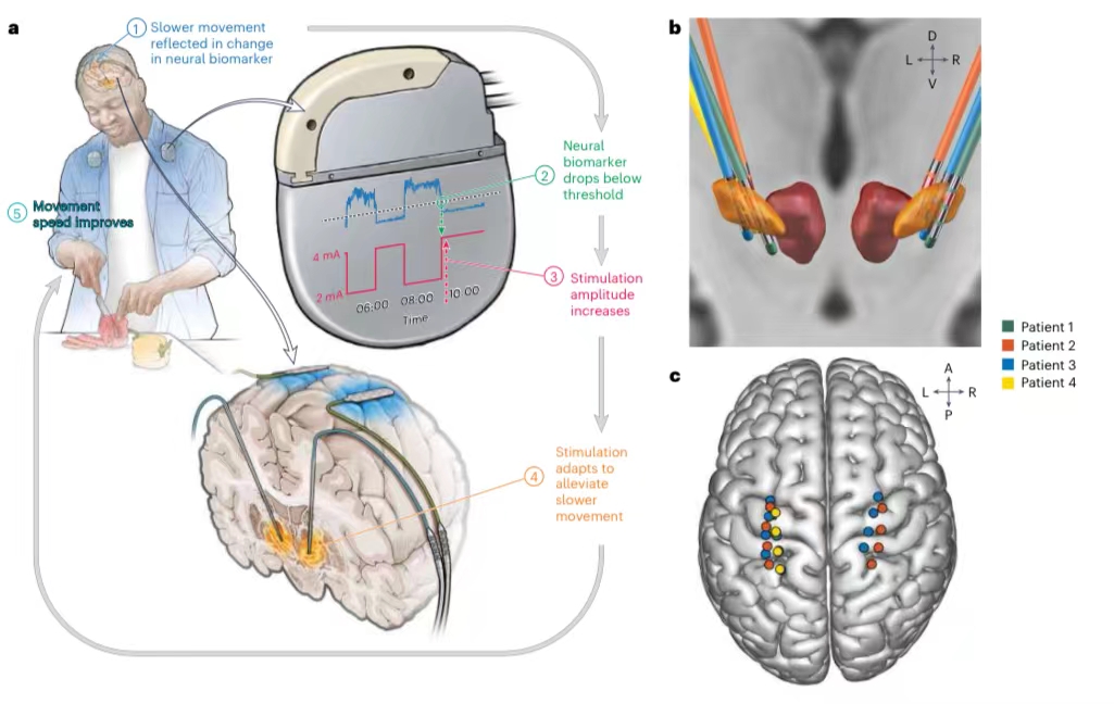此次,美国加州大学旧金山分校卡琳娜·厄恩团队为4名帕金森病患者植入了电极和神经刺激器,以实现大脑传感和反馈控制。随后数日,他们记录了患者在诊所和家里的脑活动,并用自我报告的运动日记和智能手表监测患者症状。他们通过一种数据驱动方法,确定了底丘脑核和运动皮层的大脑活动信号,这些信号是药物波动和帕金森病相关运动症状的可靠生物标志物。