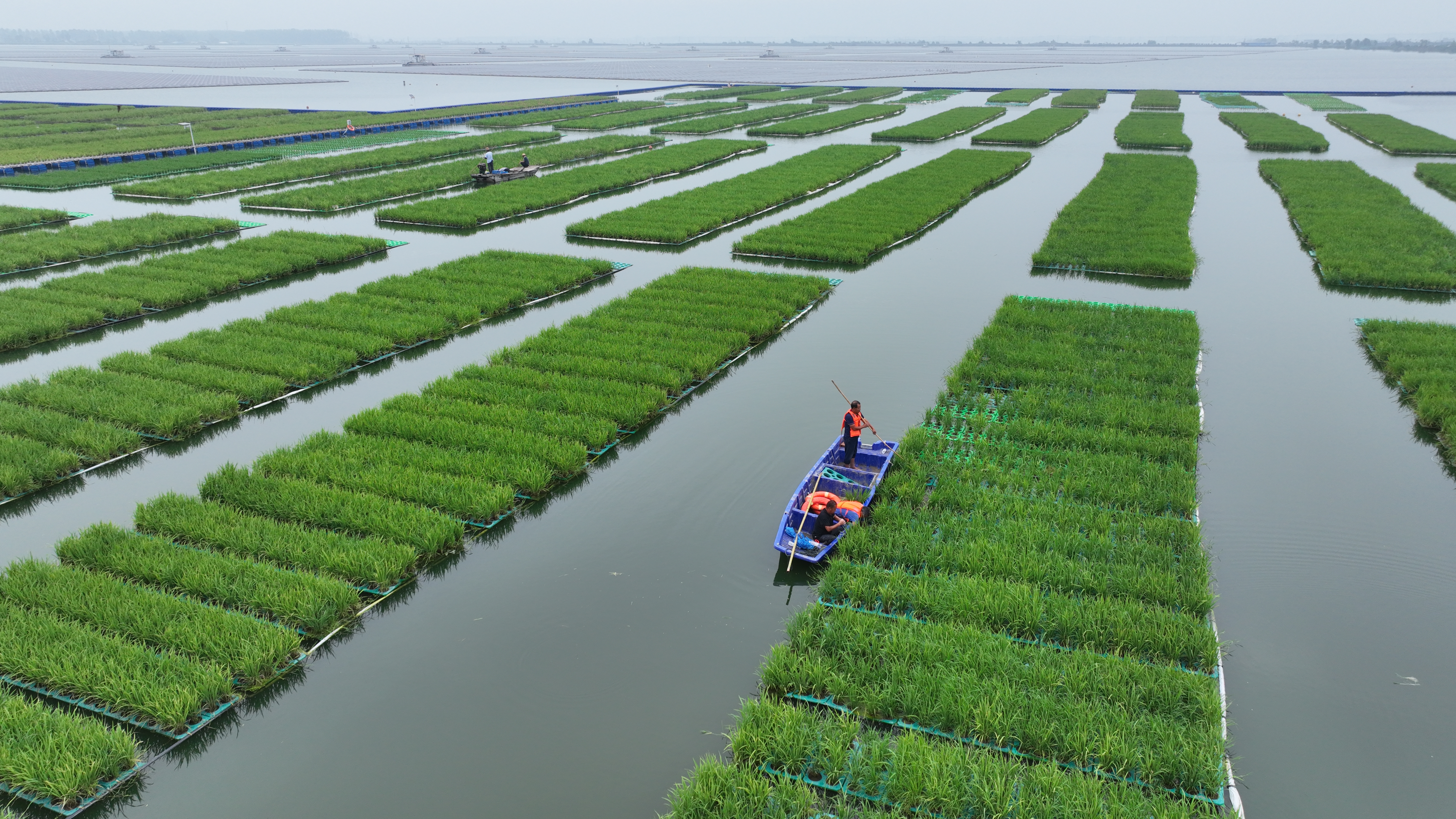 顾桥采煤沉陷积水区上的“漂浮式绿色稻田”(谢睿 摄)