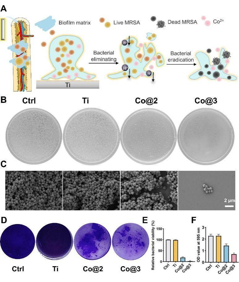 研究团队通过等离子体浸没离子注入技术,实现了一步式制备含钴元素的钛基植入物。这些植入物具有出色的生物物理适应性,能够调节免疫功能,促进感染性骨缺损的愈合与组织再生。研究表明,此类植入物有效地破坏了细菌生物膜的形成,以耐甲氧西林金黄色葡萄球菌为例,其粘附率降低了80%以上,展现出显著的抗菌活性。研究发现,这种新材料促使巨噬细胞转变为有助于组织愈合的表型,形成了有益于骨骼重建的免疫微环境,并表现出降低TRAP酶活性的倾向。研究分析了钴元素如何通过影响骨免疫反应,引导骨髓间充质干细胞向成骨方向分化,为发展骨修复材料提供了强有力的实验证据。