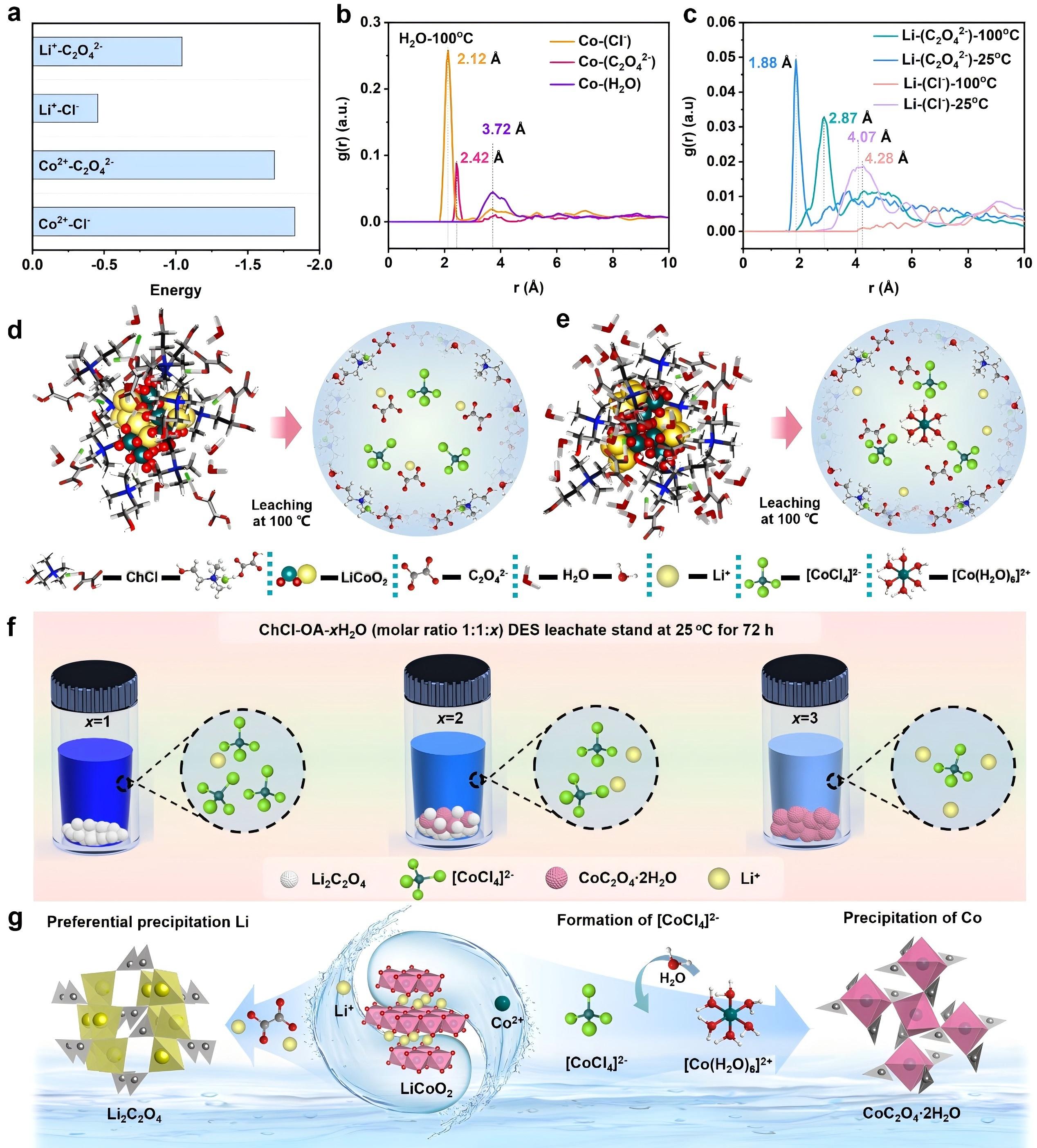 此外,团队还首次系统分析了水含量对低共熔溶剂中离子竞争配位的调节机制。通过分子动力学模拟,揭示了水含量及浸出温度对离子竞争配位的影响,进一步阐明了锂的优先析出和钴的精准分离机理。这一成果,不仅为废旧电池中有价金属的回收提供了理论支撑,还为其他类型电池材料的回收提供了借鉴。