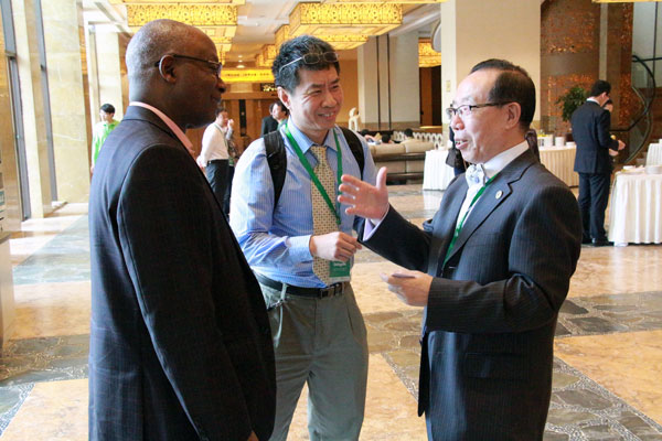 王肇文执行主席与喀麦隆驻华大使马丁•姆巴纳在休息期间交谈。
